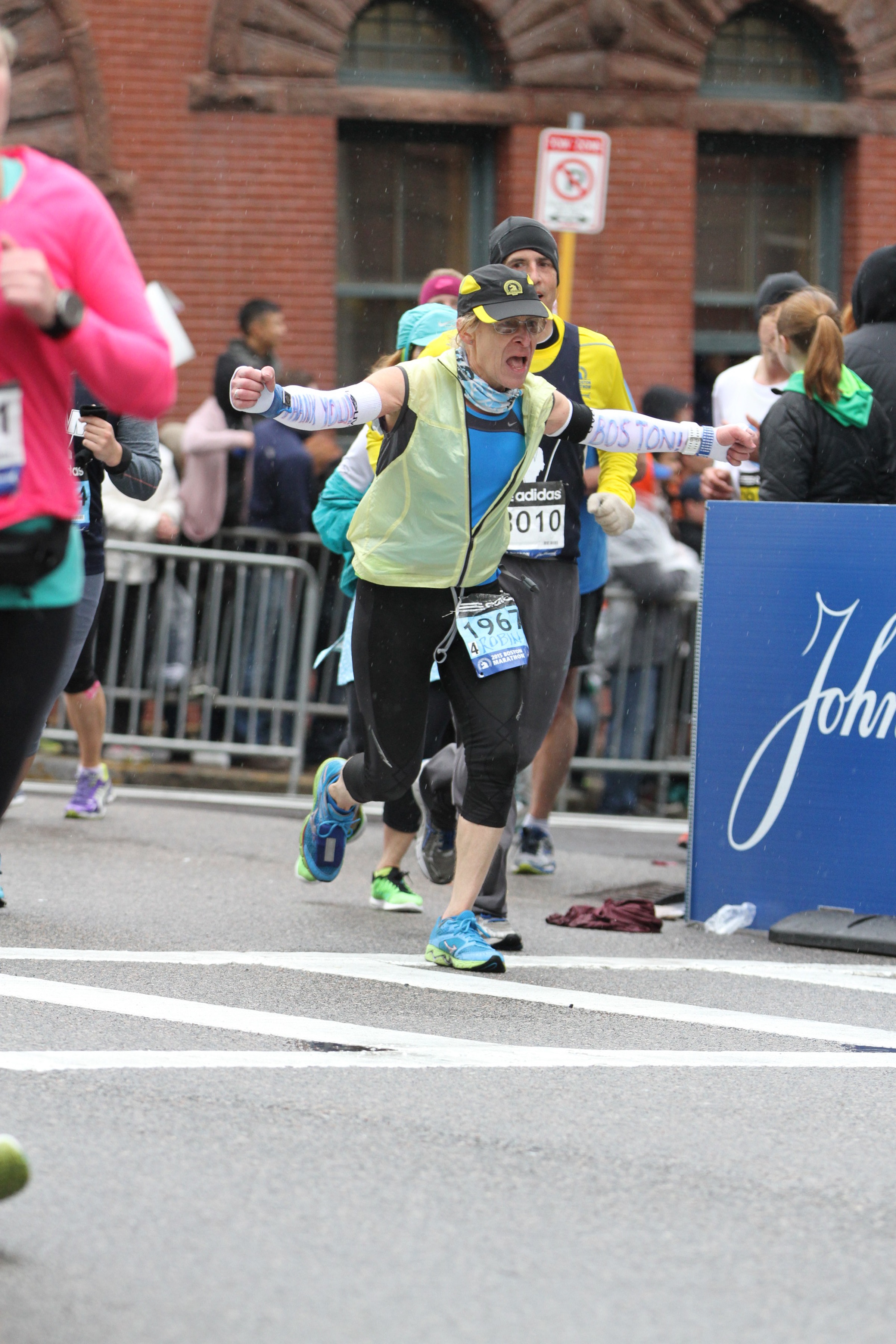 Along the way you stop a couple of times to take photos of the hoard – never brought your phone on a run before, but since this is the last one, and since it is the big time, it seemed like a good idea, and it lets you catch a photo of the sign for Framingham – where your father returned again and again for surgery after the war, which connects in your mind with the uniformed servicemen and women controlling traffic at many of the cross-streets. There are a hundred little things like that to see and remember, but mostly it’s the continuous cheering crowd lining both sides of the route, with their signs and high-fives and kids reaching out for hand-slaps as you pass by, that make it feel like coming home, generating warmth not just from the rising sun or the sweat, but from the good will pouring out all around you.